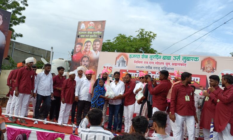 अक्कलकोट ( प्रतिनिधी ) अक्कलकोट येथील थोर सुफी संत सर्वधर्मीयांचे श्रद्धास्थान असणारे हजरत शेख   नुरद्दीन  बाबा चिस्ती दर्गा ऊर्स निमित्त एन एस  सोशल ग्रुप तर्फे गोरगरीब , वंचित महिलांना धान्य वाटप करण्यात आले. सदरचा कार्यक्रम हा दिनांक १२ ऑगस्ट रोजी खासबाग गल्लीतील डॉ.एपीजे अब्दुल कलाम चौक येथे घेण्यात आला. आमदार सचिन कल्याणशेट्टी यांच्या मार्गदर्शनाखाली सदरचा कार्यक्रम पार पडला. या कार्यक्रमास श्री स्वामी समर्थ अन्नछत्र मंडळाचे कार्यकारी अध्यक्ष अमोलराजे भोसले , माजी नगरसेवक सद्दाम शेरीकर , ननू कोरबू आरपीआय आठवले गटाचे तालुकाध्यक्ष अविनाश मडीखांबे , नितीन महाराज पुजारी , समाजसेवक तम्मा  शेळके , सोलापुर येथील बी एस फाऊंडेशनचे संस्थापक अध्यक्ष बाबा सालार ,एबीएस ग्रुप संस्थापक अध्यक्ष अब्दुल शेख ,अफसर शेख , आर वन ग्रुपचे संस्थापक अध्यक्ष रियाज हुंडेकरी , एन एस सोशल ग्रुपचे संस्थापक अध्यक्ष नुरद्दीन शेख , उपाध्यक्ष मजहर नीटोरे ,आधारस्तंभ शब्बीर शेख , मेहबूब पालंडे , अरबाज शेख , नाविद डांगे महबूब मुल्ला मोट्याळ , अतिक बागवान , शिवराज स्वामी आदींची प्रमुख उपस्थिती होती. उपस्थित मान्यवरांच्या हस्ते शंभरहून अधिक गोरगरीब वंचित महिलांना तांदूळ व गहू धान्य वाटप करण्यात आले .प्रारंभी उपस्थित मान्यवरांचा सत्कार एन एस सोशल ग्रुपचे अध्यक्ष नुरद्दीन शेख उपाध्यक्ष मजहर निटोरे व पदाधिकाऱ्यांच्या हस्ते करण्यात आला. या कार्यक्रमास सद्दाम शेख, नुरदिन जिगररानी, रमजान शेख , फिरोज शेख ,बुडन पटेल , सोहेल नीटोरे ,यासीन शेख , जुबेर कमलीवाले , अझहर हिप्परगी , आजम सुतार , एजाज सुतार , शब्बीर बंदेनवाज , भीमाप्पा आयगोळे , इब्राहिम हिप्परगी , अबू शेख , नुरद्दीन खलिफा ,समर्थ मडिखांबे , सागर बनसोडे आदींसह एन एस सोशल ग्रुपचे पदाधिकारी , कार्यकर्ते मोठ्या संख्येने उपस्थित होते.