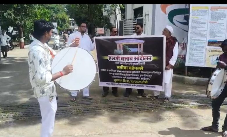 नगरपरिषदेच्या मुख्याधिकारी यांची बदली साठी जिल्हाधिकारी कार्यालयासमोर हलगी वाजवून केलेल्या आंदोलनाला यश .
